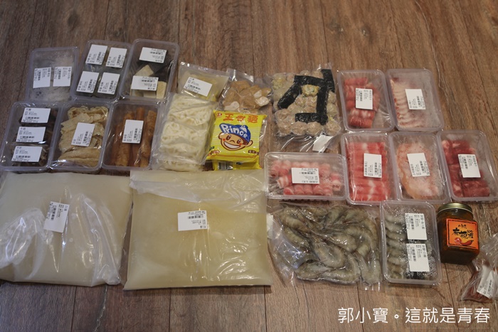 把全部的食材都放癱在地上看一下,兩大箱全部拿出來的品項幾乎肉品、海鮮、內臟類、火鍋料應有盡有,還有兩包各3000CC的雙湯頭,它們總共有四種湯頭可以選擇,分別是麻辣、酸白菜、豚骨跟天香回味四種,但是宅配的部分只有提供三種,少了天香回味,我這次選擇是的川味麻辣跟東北酸菜兩種湯頭,湯頭都是配好的,自然退冰後放入鍋內即可,先跟大家報備一下他的規格。