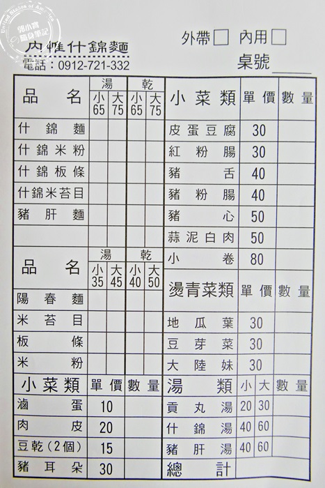 | 菜單都是麵類為主,有麵有米粉有板條有米苔目,看是要吃一般普通的,或是他們家招牌什錦的,也有小菜跟燙青菜類的,不想吃麵也能只點湯就好,全看客人喜好,通常都是一碗什錦麵就無敵啦!艾編也常常都是來吃碗麵這樣,他們家的價格算一般,跟其他常見的麵店價格差不多,每桌桌上都有菜單可以做填寫畫單,但因為艾編今天來的時間點沒有客人,直接口頭點餐就可以啦! |