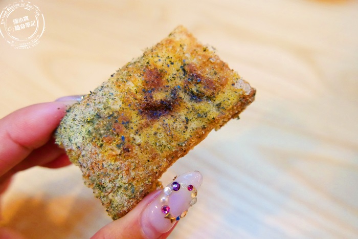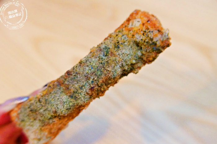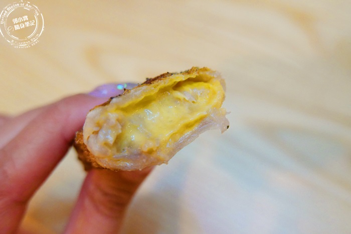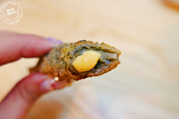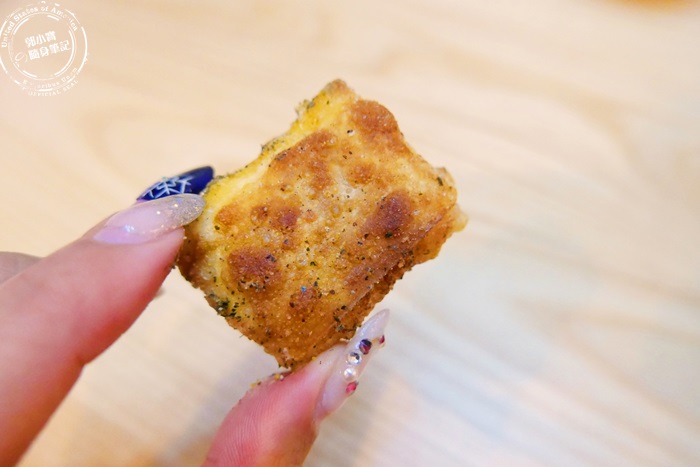 | 每個起司餃的形狀長的不太一樣,香草羅勒是長條狀的,吃起來口感比較緊實,水餃皮很有嚼勁,外層酥脆,灑上特製的粉,鹹鹹甜甜的酥香氣息,勾勒出裡頭羅勒淡淡芬芳香氣,配上濃郁爆漿起司,太爽口好吃了,完全不油膩,雖然不是會拉絲的起司,但是這濃郁的滋味令人著迷呀!雖然老闆娘說香草羅勒是屬於重口味的,但是艾編覺得還好而已,不是太重口味唷! |