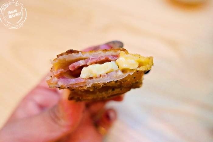 | 店裡面人氣第一名的乳酪培根,水餃皮包著培根,裡頭除了有原本濃郁的起司,還多了塊狀的乳酪,雙重滋味雙重滿足呀!濃郁鹹香柔軟有彈性的煙燻培根,搭配在一起味道極好呀!金黃酥脆的外衣,香氣十足,口感太有層次啦!好吃。 |