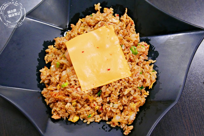| 說也奇怪,這炒飯剛剛炒出來明明就很熱,可是上面的起司片都不融化,起司片配上炒飯,不會不搭,就是多了奶香的濃郁感,味道上比較香醇和諧,但是沒有什麼太大的加分作用,不過他們家的泡菜真的還蠻好吃的,有一種台韓混血的感覺,上次吃他們家的泡菜鍋燒味道就超棒的,而且配料也很豐富,大家也可以試試看鍋燒類的,不錯吃唷! |