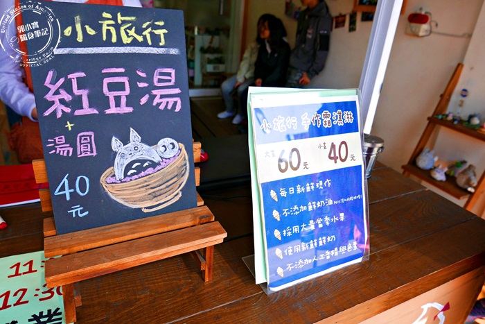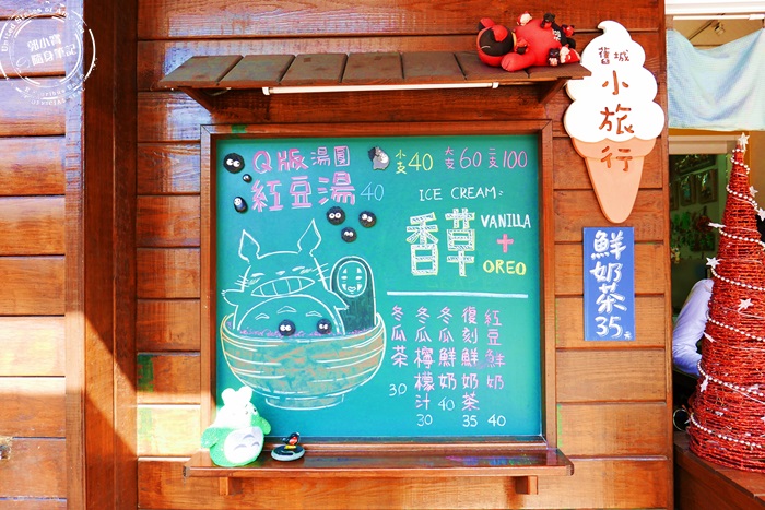 | 除了賣霜淇淋還有很Q的造型紅豆湯,還有飲品的部分唷!可以看大家的需求來點餐,這一面黑板的菜單設計,非常的有巧思塗鴉的也很用心,佈置的非常好拍照,店名也非常的可愛,來「舊城·小旅行」吧! |