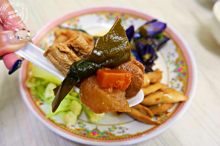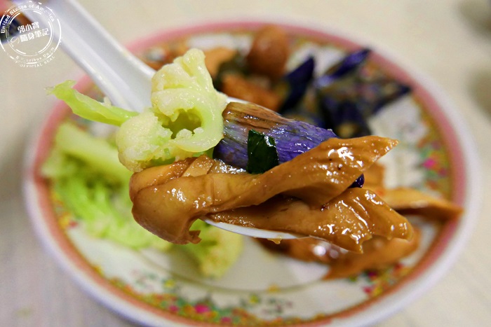 | 素菜車輪圈使用麵粉製成的,蓬鬆的可以吸收很多湯汁,變得更有味道,軟Q的口感每一口都有湯汁溢出,濕潤好咀嚼,菜頭跟紅蘿蔔燉的很軟爛,香氣十足,最喜歡豆皮的濕潤柔軟口感,超下飯,豆香超濃,他們家的菜色不會太油膩,味道也相當不錯唷! |