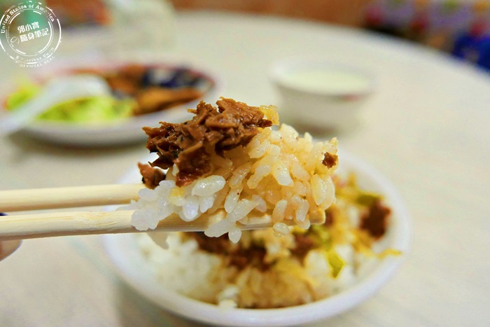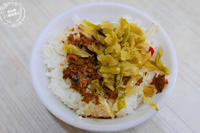 因為艾編不是點粥吃,所以阿姨們問艾編要不要來碗清湯,就是剛剛那一碗,真的很貼心兒唷!這碗素肉燥除了有俗稱的皮絲(台)使用麵粉製成的,再加上細碎香菇滷成的,很有味道很下飯,但是完全不死鹹,味道跟口感都蠻好的,滷汁的味道跟香Q的白飯配著吃,濕潤度夠,滋味超棒的,加上酸菜開胃清爽,整個停不下來呀!立馬扒光光,比葷的肉燥飯還好吃唷!重點這樣一碗才$15,超級便宜的。
