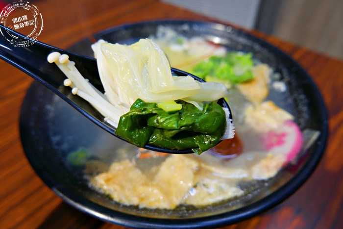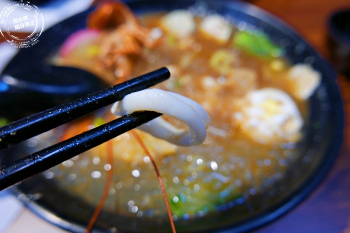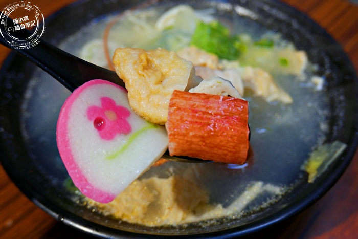 | 火鍋料的部分就有四、五種,常見的魚板、貢丸、蟹肉棒、天婦羅,這裡面通通有,是不是很澎湃,鍋燒麵就是要滿滿的配料吃起來才不會空虛,這一碗不用$100就能吃的超滿足唷!如果你以為就只有這樣,那就錯囉!厲害的在後頭。 |