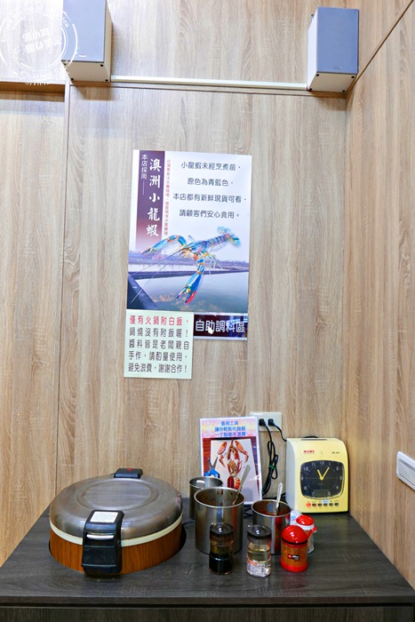 | 放置白飯跟醬料的地方,還有介紹他們家使用的小龍蝦是澳洲進口的,客人們若有疑問都可以直接現場看,老闆做生意可是很講誠信的,品質也絕對要好,有青才敢大聲呀!只有火鍋的部分有附白飯,鍋燒的沒有唷!大家來要乖乖的遵守唷!如果怕自己會吃不飽就點火鍋吧!還有他們家的醬料都是老闆自己手工製作,味道超棒的,不過大家要斟酌使用不要太浪費了。 |