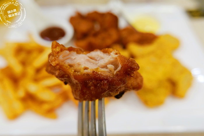 | 這個嫩雞還蠻大推的,裹了粉漿的雞腿肉,炸過後的酥脆外衣,一口咬下鮮嫩多汁,醃的入味,軟嫩的雞腿肉太鮮美,可惜份量不是太多,吃的有點不過癮。 |