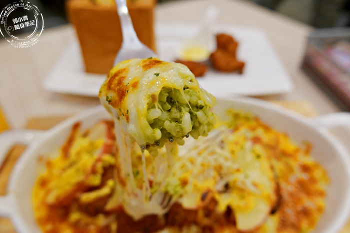 | 艾編是起司控,所以就把起司加量,他們家加雙倍也才加$20,這麼划算,不加太可惜了,看看那烤過的起司,奶香濃郁配上羅勒風味的焗烤飯,相輔相成的氣味好幸福呀!完全不膩口,份量多,吃的超滿足。 |