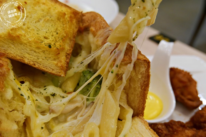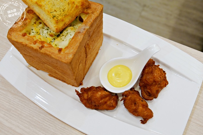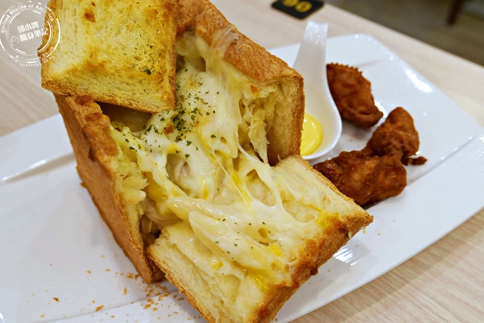 | 就是長高變深的棺材板來著,也有鹹的蜜糖吐司概念這樣,將吐司挖空,填入餡料,放上乳酪絲下去烤,外層的麵包超酥脆,搭配內餡一起吃,超飽足的,嫩雞的部分就是跟剛剛單點的炸物一樣,不過這個吐司盒子套餐只有三塊嫩雞,有點小空虛,一樣附上蜂蜜芥末醬,口感味道都相當的有層次呀! |