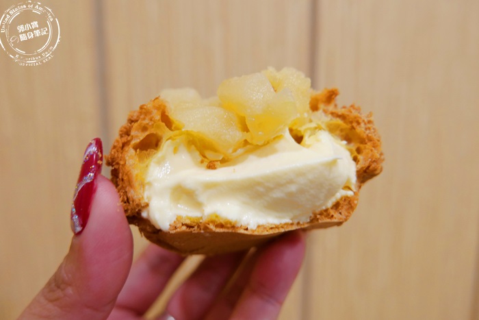 | 完整的名字叫做蘋果乳酪,簡稱蘋乳聽起來好像怪怪的,不過這口味還蠻厲害的,使用自家手工炒的蘋果丁,加上他們特調的乳酪餡,乳酪的香醇厚實感,綿滑順口香氣十足,加上炒過的蘋果丁,蘋果的香甜氣息,微微脆度的口感,酸酸甜甜的剛好中和掉乳酪可能會帶來的膩口,因為這個內餡比較豐富,所以必須將完整的泡芙殼切開,填入內餡,這個好吃又好拍,口味真的很特別唷! |
