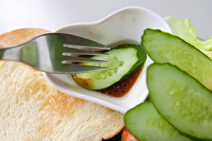 | 沙拉的部分很豐盛份量也很足夠,有生菜蕃茄還有小黃瓜,沾上店家特調的油醋醬,整個好清爽開胃,蔬菜的脆甜加上醬汁微微的有帶點芥末的嗆辣,挺好吃的,艾編瞬間吃光光。 |