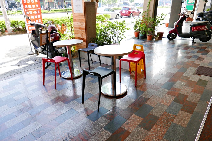 | 前方騎樓空間就擺放兩張桌子跟椅子而已,還是高腳的唷!感覺挺不錯的,寬敞的空間,只是旁邊車水馬龍所以些許吵雜了點。 |