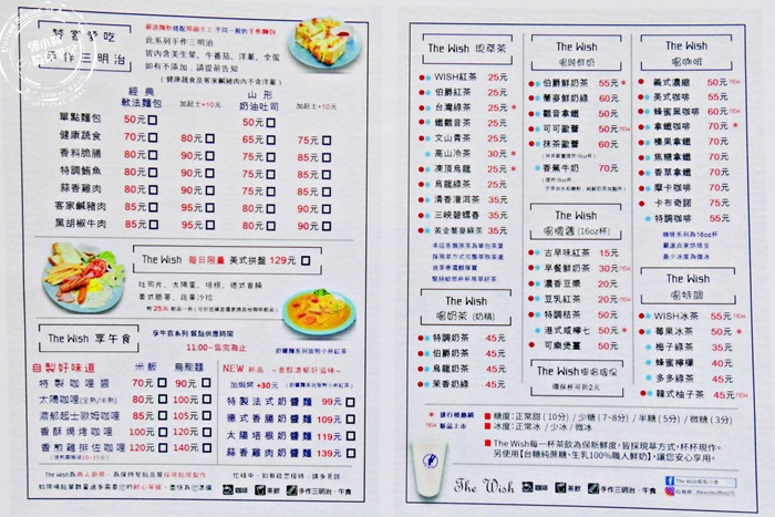 | 菜單蠻豐富的,原以為他們家應該都是以咖啡、飲品為主,沒想到跟早餐店沒兩樣,吐司、蛋餅通通有,重點口味還不少,也有炸物點心可以選擇,感覺還不錯。 |