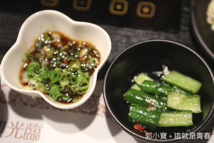 | 醬料跟小菜是服務生幫妳準備好的,特製的沾醬非常爽口,小黃瓜也很入味,可以跟服務生要生辣椒,滋味真的很棒。 |