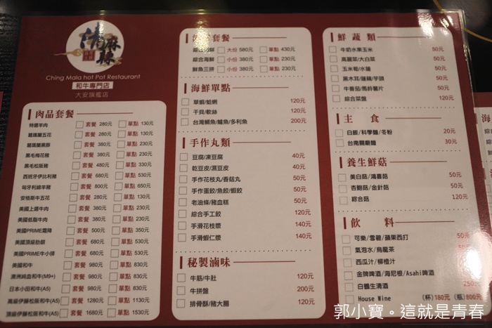 | 仔細看了一下菜單,完全顛覆我在網路上對她的認識,其實它們還滿平價的阿,可能隻前人都介紹他們家的和牛套餐,所以讓人產生很貴的認知,其實它們的一般鍋物也跟街邊的涮涮鍋價位差不多,很貼心的價格,重點是不管大小鍋都是一樣的費用。 |