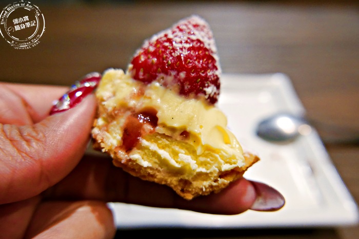 | 他的塔皮很酥很香,脆的像是手工餅乾一樣,較有硬度,濃濃的奶香風味,配上香草卡士達的香甜,還有乳酪微微帶鹹度的起司香,加上草莓酸甜開胃,口感層次超豐富卻和諧的不互相搶味,除了新鮮草莓之外裡面還有草莓醬的夾心,加上一顆藍莓的點綴,水果帶來的清爽的感覺,融合整個內餡跟塔皮,真的超喜歡的,外帶回家裡面,小朋友也會瘋狂。 |