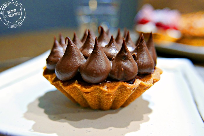 | 他們家選用71 %的比利時巧克力,調製而成的巧克力醬,直接填滿在塔皮上,水滴的造型是不是很可愛呢!靠近就能聞到的巧克力香,這款是艾編每次必點的,就是真心愛上他們調製的巧克力。 |