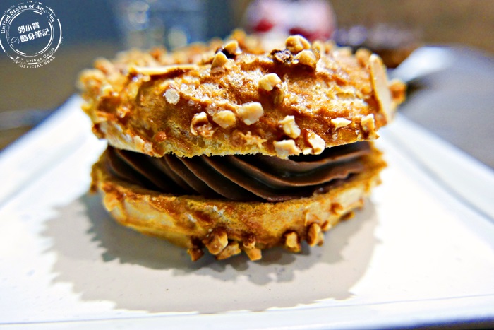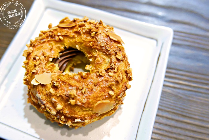 | 感覺跟現在百貨公司裡超夯的那種長條泡芙,有異曲同工之妙,都是屬於表皮比較酥脆,還有撒上一些杏仁堅果,口感香氣更豐富,這個看外表就知道好吃,他們家的泡芙每天的口味不一定,所以說不定下次你們來的時候可能不是吃到巧克力,其實他們家的甜點完全不雷,什麼都好吃,而且看起來都很吸引人,像這個轉圈圈泡芙,艾編就是第一次吃。 |