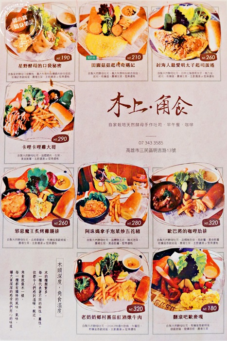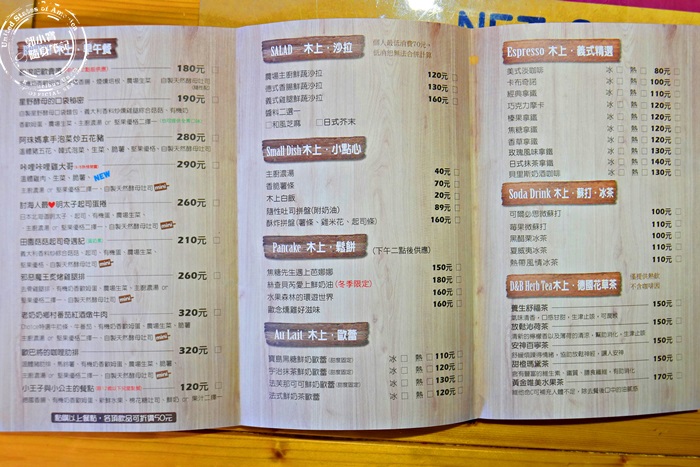 | 菜單以早午餐居多,點早午餐再搭配飲品可以折$50,其實蠻划算的,有些店家可是沒有優惠唷!其他的沙拉、鬆餅、點心也都有,反正他們家就營業到下午五點而已,提供的餐點整天都能吃,除了晚餐。 |