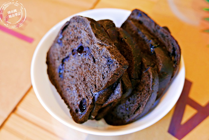 | 店家招待的黑吐司,其實也不曉得是招待的還是朋友點的,遲到的友人下去點完餐就拿了這盆上樓,剛烤好的溫溫的很舒服,原來是巧克力,店家使用進口的水滴巧克力製成的黑吐司,香醇風味加上裡頭濕潤的巧克力,濃郁帶苦甜的成熟氣息,大人小孩都愛吃,姐妹們都想買回家當隔天的早餐啦! |