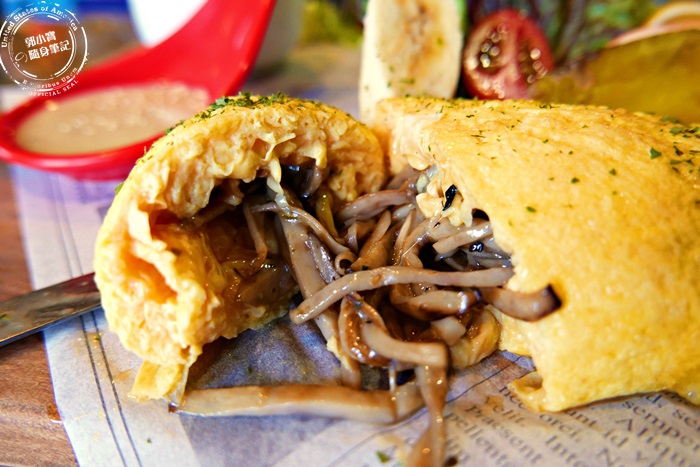 | 他們家的餐點名稱每一道都好長,剛剛的明太子切開是爆漿的起司,艾編這道切開是炸開來了菇菇,除了有滿滿的菇還有起司,菇菇的部分有先炒過,味道之香口味算清淡適中,配上起司的香濃還有那厚蛋捲的軟綿滑口,味道香氣口感完全沒話說,素食的朋友可以吃唷! |