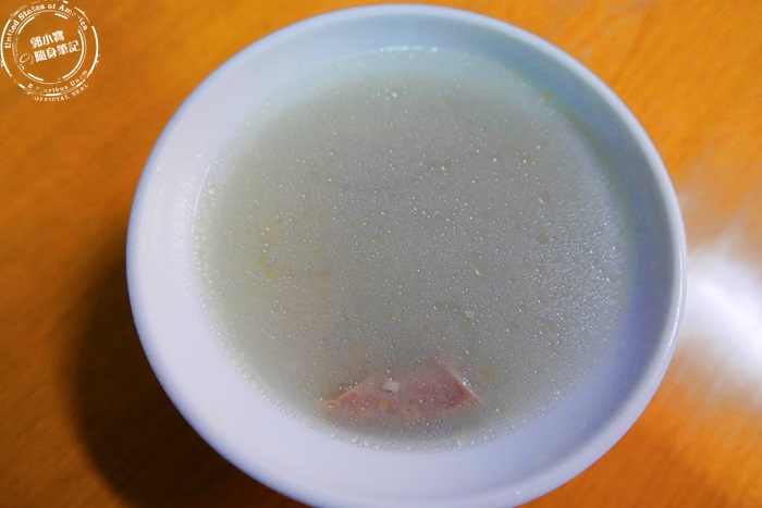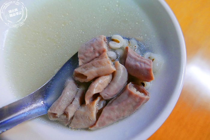 這四神湯的配料給的算中規中矩,沒有到非常的多,如果跟湯的量比例算起來是剛剛好,他們家的四神湯也是沒話說,尤其那個湯頭,超級濃郁,就是熬煮出來的大骨湯頭加上四神的藥材一起燉煮而成的,味道之香呀!不會濃的膩口,味道也不會太重,完全剛剛好的美味,鮮美甘甜溫潤,整個胃都暖起來了,裡頭的配料吃的到薏仁跟豬小腸,全部都燉煮的非常軟嫩,小腸口感非常的柔軟好咀嚼,而且咀嚼當中還能釋放出四神的香氣,薏仁也是輕輕一抿就化開,喝完這碗四神湯只有一個想法,那就是~老闆可以續湯嗎XD