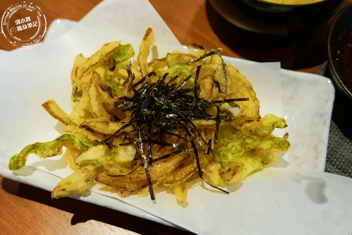在一旁的友人點的套餐,基本上都跟艾編的菜色差不多,但是他的餐點有這一塊蝦什錦,主要有蝦肉還有洋蔥絲、青椒絲、香菇切絲,這些全部裹上粉漿炸成一塊,味道很豐富,沒有很重的粉感,現炸熱熱的香氣十足,蝦肉柔軟、蔬菜脆甜,配上海苔的點綴,真的讓人彷彿置身在日本,享受這日式風格的美味呀!