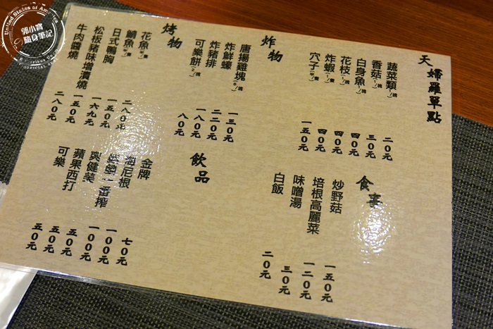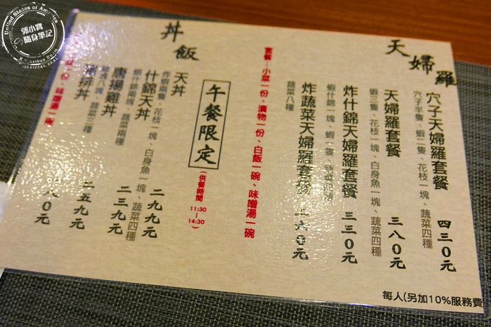 | 菜單有天婦羅的套餐,也有丼飯,價位跟一般日式餐廳都差不多,套餐的部分比較有像日式和風定食的感覺,想吃價位平價的,就可以點丼飯,吃的飽足又不傷荷包,只是丼飯部分只有中午有供應唷! |