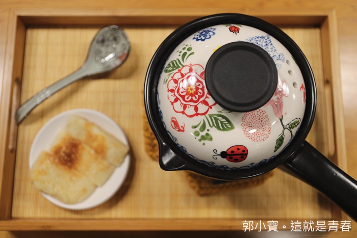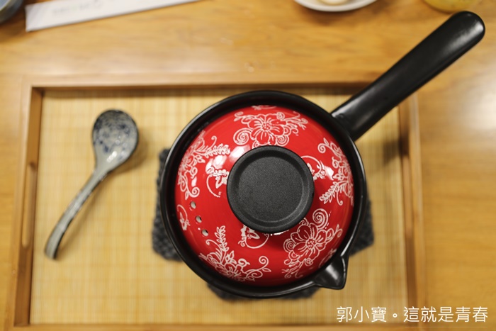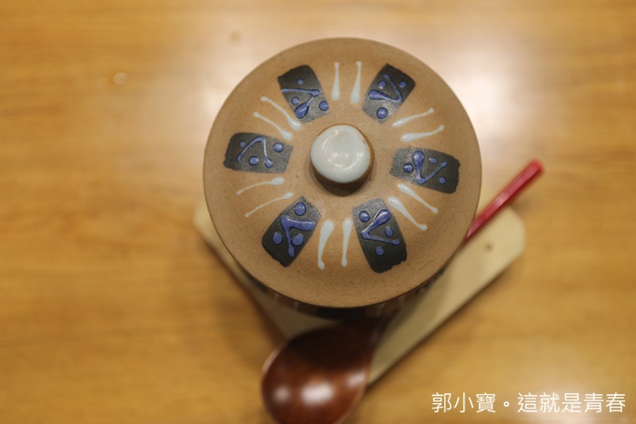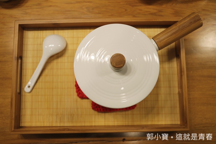| 其實我覺得木盤上面只放一個小鍋子搭配湯匙有點落寞跟空虛,如果沒有木盤我覺得還好,如果可以放個兩疊小菜會更完美。 |