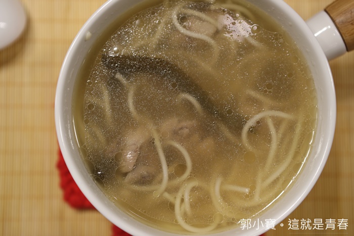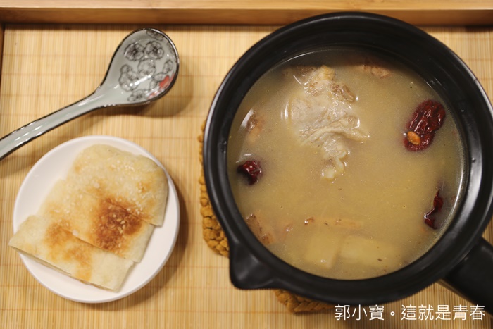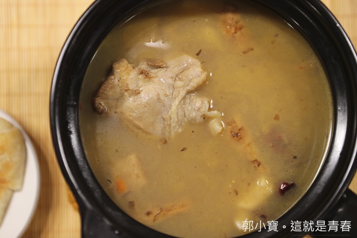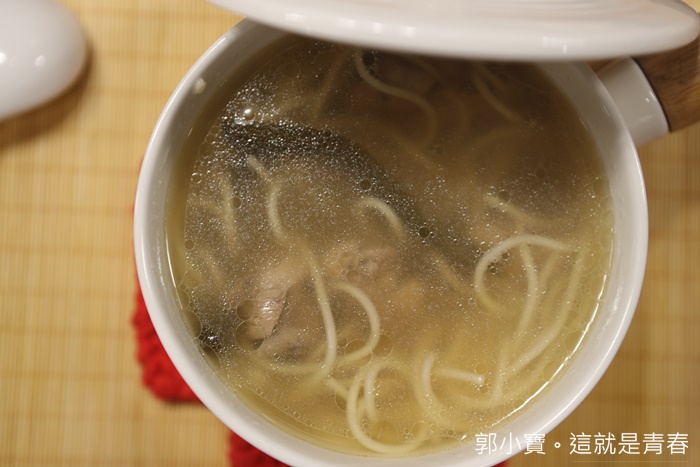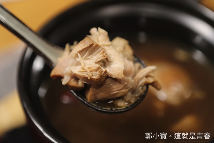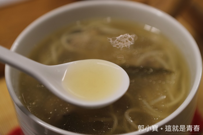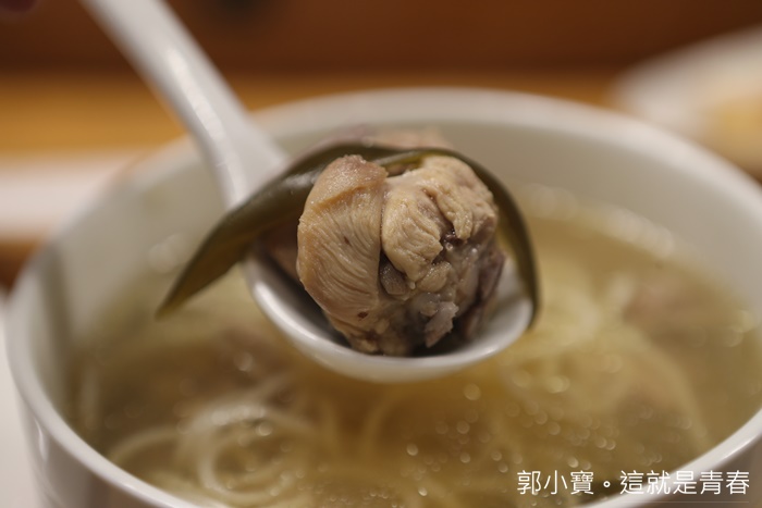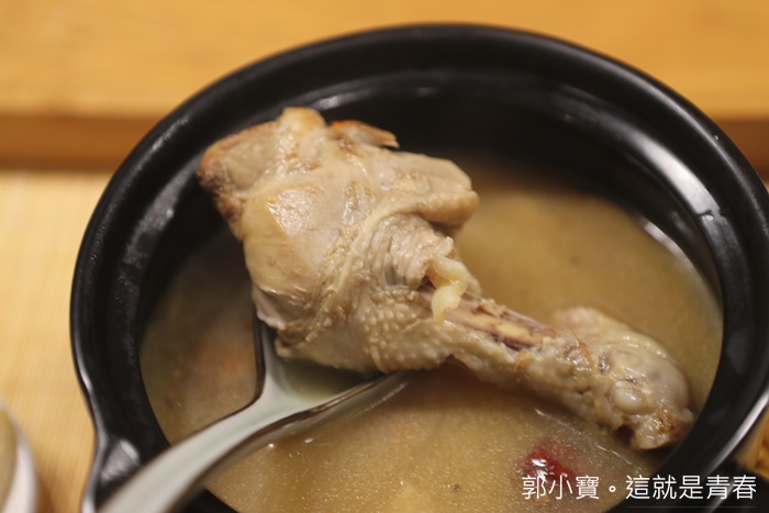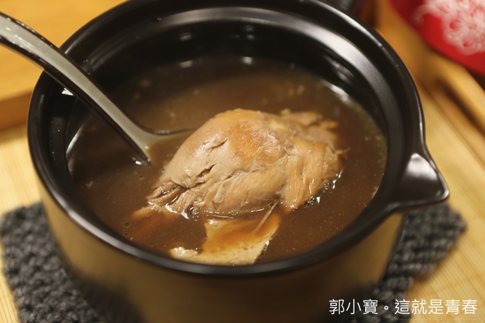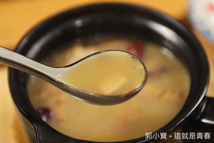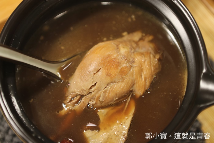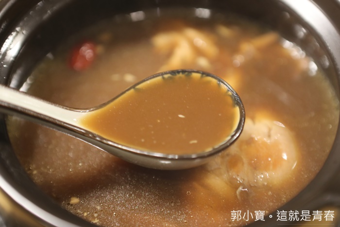 | 打開蓋子就可以聞到濃郁的雞湯&中藥味飄散出來,如果這一鍋雞湯真的是鹿角、龜板、枸杞、人參四味藥熬成的雞湯那我必須說這一碗CP值高到破表,龜鹿二仙膠一直被老人家譽為聖品,湯頭喝起來就是帶點中藥的感覺但卻不會讓人腦口,野有點像是四物的感覺。 |