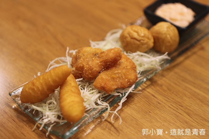 | 三種海鮮炸物組合起來的拼盤,最後面的醬料非常特別,說是裡面是苦瓜丁,但是滋味偏甜,頗有創意。 |