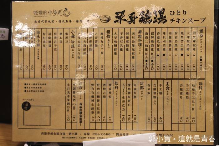| 得知高雄開了一家雞湯專門店就還滿有興趣的,趁著回高雄的時候趕緊約了朋友一同前往造訪,店名正確的名稱是單身雞湯,是左營頗有知名度的城裡的月光開的分店,城裡的月光以土雞料理聞名,轉戰南高雄開了一家雞湯專門店,所以招牌上還有一行城裡的小月光,既然是土雞料理聞名的店,所以雞湯應該也不會差到哪裡去。 |
