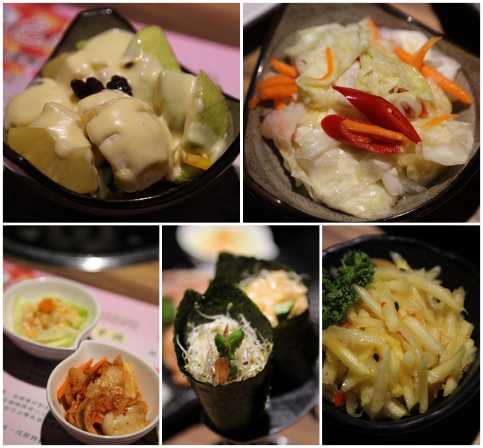 | 小菜跟沙拉的份量都給得很足,口味也不錯,當燒肉大餐前的開胃小菜真的很不錯,手卷的部份要趁快吃,不然會軟掉,手卷的部分我覺得也滿有水準的,不會因為是吃到飽的關係而有失水準,泡菜的部分後來有一些搭配燒肉味道更棒!! |