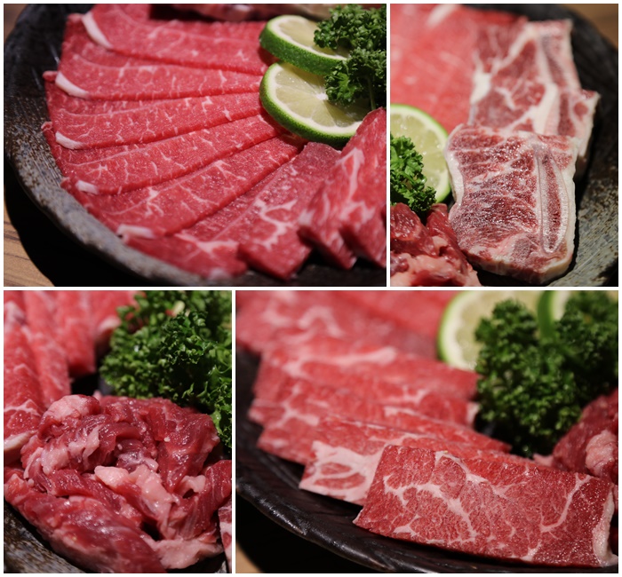 | 牛肉套餐給了四種肉品,四種牛肉分別有特選板腱肉、特選牛小排、頂級冷藏牛肋條、特選厚切莎朗,四種肉品看起的肉質都非常不錯以外,牛肉的顏色看起來也很漂亮,牛小排的油花看起來也相當不錯!! |