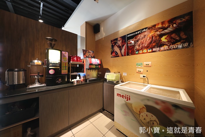 | 自助區除了有果汁跟汽水免費享用以外,還有咖啡機跟水果茶等飲料,一旁的是明治冰淇淋櫃,冰淇淋也是自助式免費享用唷! |