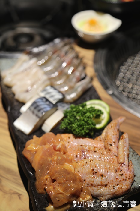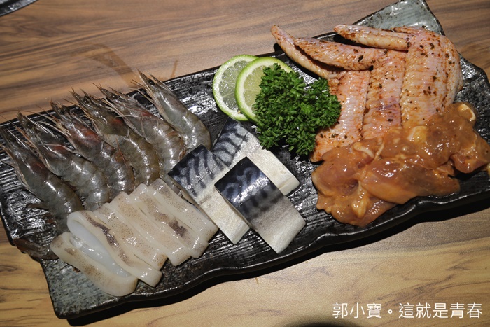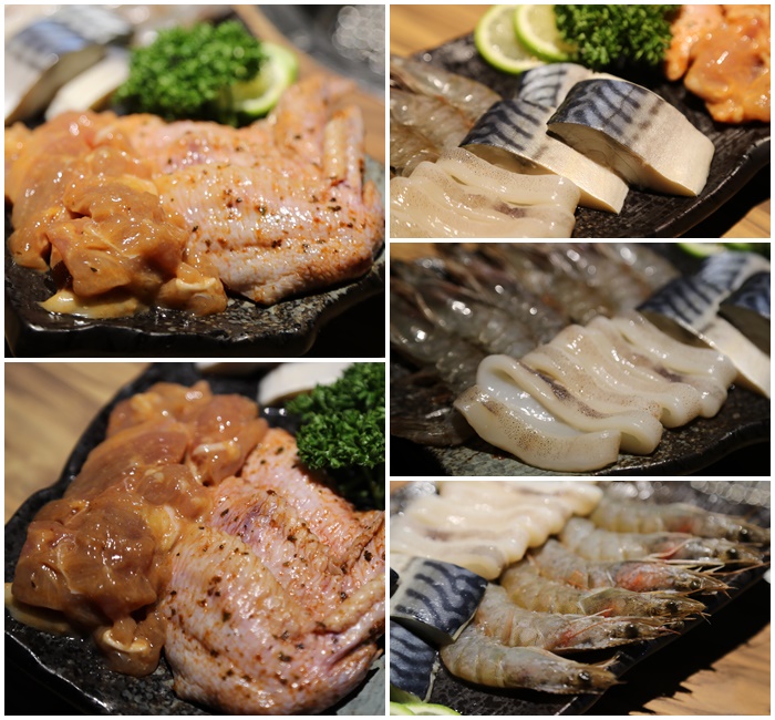 這一份套餐裡面的食材分別有味噌雞腿片、羅勒烤雞翅、鹽烤鯖魚、鹽烤魷魚圈、鹽烤白蝦,海鮮的部分主要都是吃鹽烤原味為主,色鼎的鹽烤鯖魚真的非常好吃!!!!!!