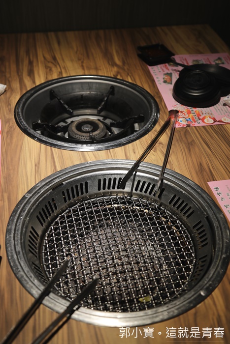| 到達我們的座位後仔細一看才發現它們每一張桌子是一個烤爐一個火爐,烤爐的部分是使用下吸式的抽風機,這樣才不會感到烏煙瘴氣的,旁邊的火爐是來這邊享受烤肉還可以得到一鍋免費的火鍋!!!! |
