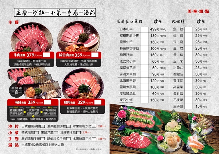 套餐裡面還有附贈沙拉小菜手卷跟湯品,前面三種都有三擇一的選項以外,湯品如果兩人以上還可以換成一份火鍋,非常超值!!!菜單旁邊還有加點區,單價看起來都很便宜,就連火鍋料的價位都比平價臭臭鍋還便宜,真的非常佛心的價錢,一不小心就會點到手滑!!