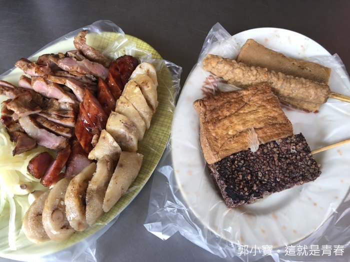 | 有黑輪當然少不了大腸跟香腸,一旁還有烤著三層肉看起來也很誘人,因為它們也有賣便當跟飯類,經營項目真的琳琅滿目。 |