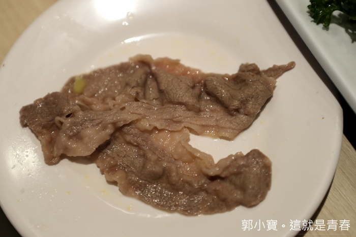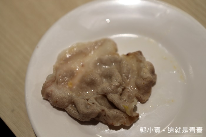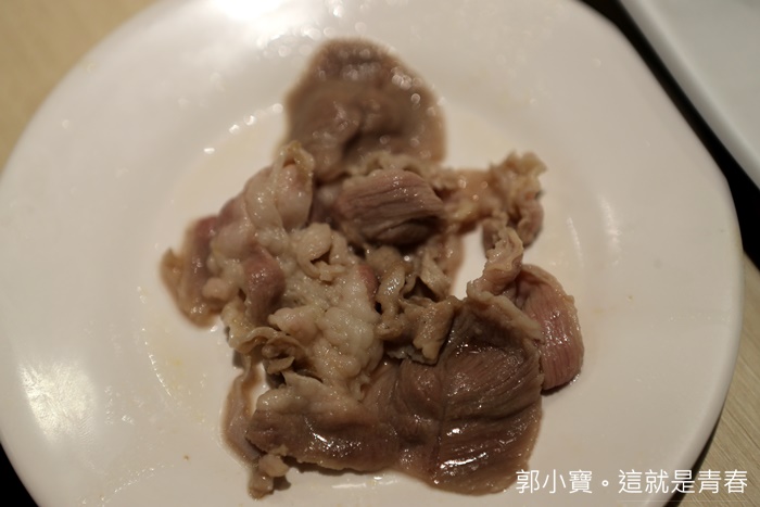 美胸腹肉涮一下麻辣鍋後吃起來味道還不錯,油花的部分吃起來帶點Q度,很順口呢!!