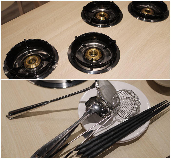 | 小火鍋的爐具不是使用電池爐,使用的是火爐,餐具的部分也提供的很完整,不說我還以為到了專業的火鍋店,網勺跟扁勺都有提供。 |