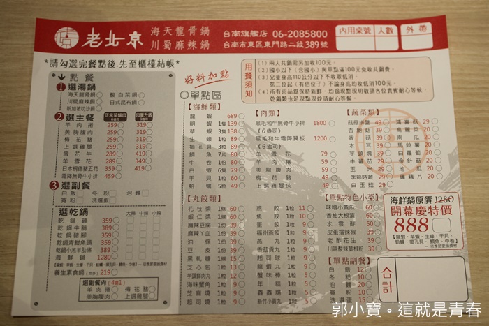 | 每次來台南總有吃不完的口袋名單,這次應該跟一群人一起來共遊台南,一群人移動真的比較不方便,後來在東門路上找到了這一家老北京個人鍋物,看起來是非常漂亮且就是想吃火鍋的那剎就決定是他了,餐廳旁邊小路進去就有停車場,步行不用三分鐘,也是因為有好停車的地方所以才選中老北京,台南停車真的有點麻煩,有停車位真的方便很多。 |