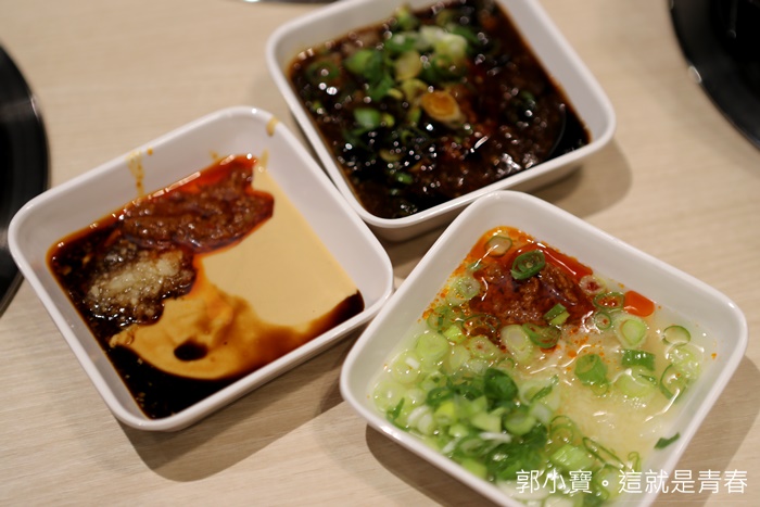 | 沾醬的部分除了店家推薦的配法以外,當然最主要還是依照大家各自喜歡的口味,我超愛用豆乳醬加上生辣椒還有蒜泥、醬油,我個人比較重口味啦XDDDD |