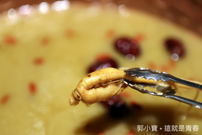 | 可以看到仙氣鍋上面飄了一層膠原蛋白,是使用大量的雞腳熬煮出來的原因,另外還有千年普洱與地藏黃精跟其他配方一起去熬煮出來的,據說是師傅遠去求來的配方,地藏黃精指的是人蔘,撈了一下真的可以夾起一整根的人蔘,大氣啊!!!!! |