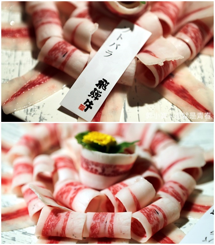 | 這次的目標就是為了這美味的飛驒牛來的,目前店家推出的活動就是這一份飛驒牛牛五花買一送一,真的非常划算,這麼美的飛驒牛牛五花等於一大盤只要500多元,油花非常的漂亮如雪脂般,紅肉也可以看到一些大理石般的紋路。 |
