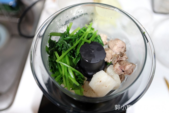 | 除了波菜以外另外再把熬煮高湯後的山藥、排骨肉等等的食材一起放入食物調理機裡面打成泥就大功告成了,建議剝離排骨肉的時候一定要小心不要剝到有硬物的骨頭,我們都特別挑選比較肥跟有油脂的部分。 |