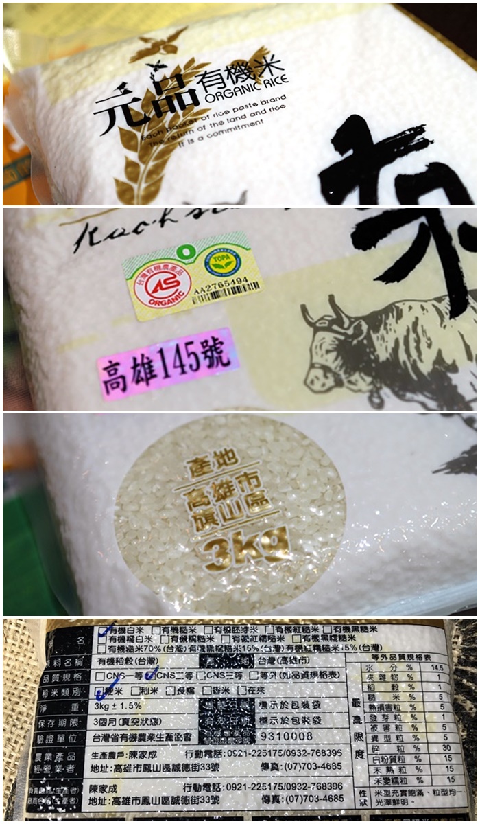 | 元品這個品牌其實已經成名已久,也是有機米界的常勝軍,常常在很多農糧署舉辦的比賽裡面看到元品的身影,這源自我家鄉高雄種出來的有機米當然要好好地品嚐一下,我們可以看到元品有機米的外包裝正面,有很清楚地標明產地跟米種,還有有機的認證標章跟台灣省有機農業生產協會TOPA的雙認證,背面的產品規格資訊也都很詳盡,讓消費者可以很迅速明瞭地分辨出自己想要的產品。 |