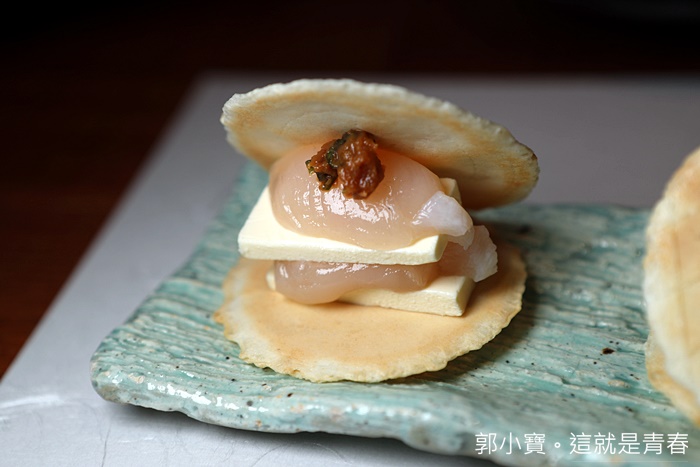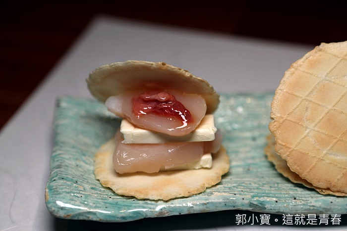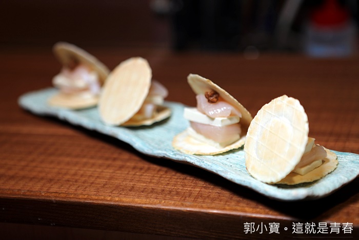 | 這一道菜品我也是第一次點,據說是惠比壽店的人氣商品,視覺上真的很吸引人,也被稱為干貝夾餅,一份四顆的份量看起來價位也不會感覺太貴,一份裡面有兩個口味的感覺,不知道主廚會不會依照當季盛產貝類而變煥。 |