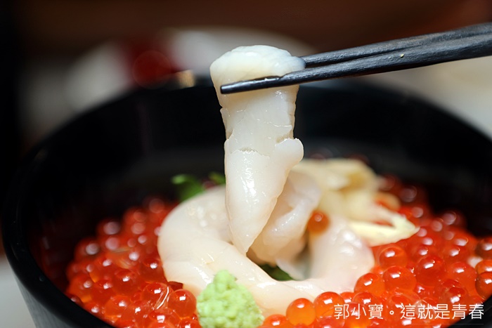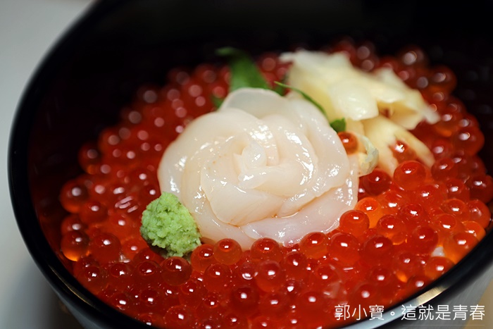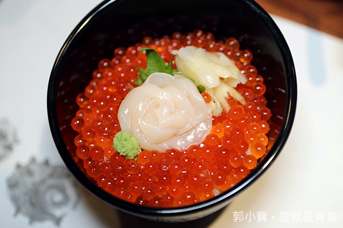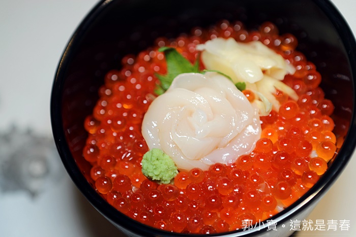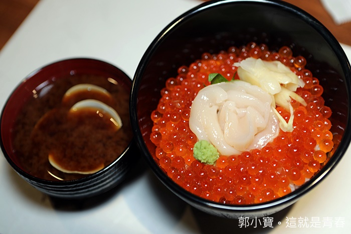 | 我的主餐就是這超誘人的干貝鮭魚卵井,以前都要去日本才有機會吃到這滿滿的鮭魚卵井,日本的鮭魚卵井要價不斐以外,通常碗都是小小的一個,但是あこや太羽提供的碗卻是滿大的尺寸,最上面一層鋪了超滿的鮭魚卵,據說是主廚直接從北海道寄生筋子來台灣,然後在台灣直接洗跟醃漬,因為北海道的鮭魚卵11.12月是產季,所以現在吃正是時候,也算是非常限量的商品!!! |