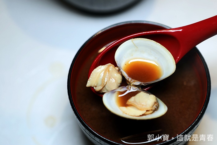 | 就連附贈的味噌湯也很有誠意,滿滿的大文蛤超甜以外,味噌是使用紅味噌,所以喝起來非常濃郁帶點苦甜味,很好喝的味噌湯。 |
